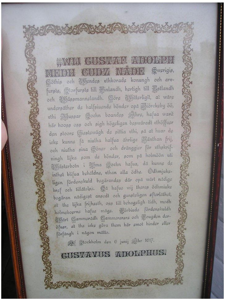 Här är ett av de kungabrev som sändes till Björköby från den svenske kungen med meddelande om befrielse från krigstjänst och skattelättnader för Björköborna.