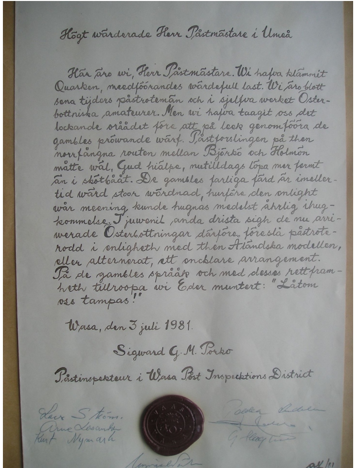 Här är brevet som överräcktes till Umeå Stad och Posten i Umeå av sju finska roddare, vid det allra första försöket att återuppliva den traditionella postforslingen, då man rodde från Bulleråsen till Holmsund 3 juni 1981.